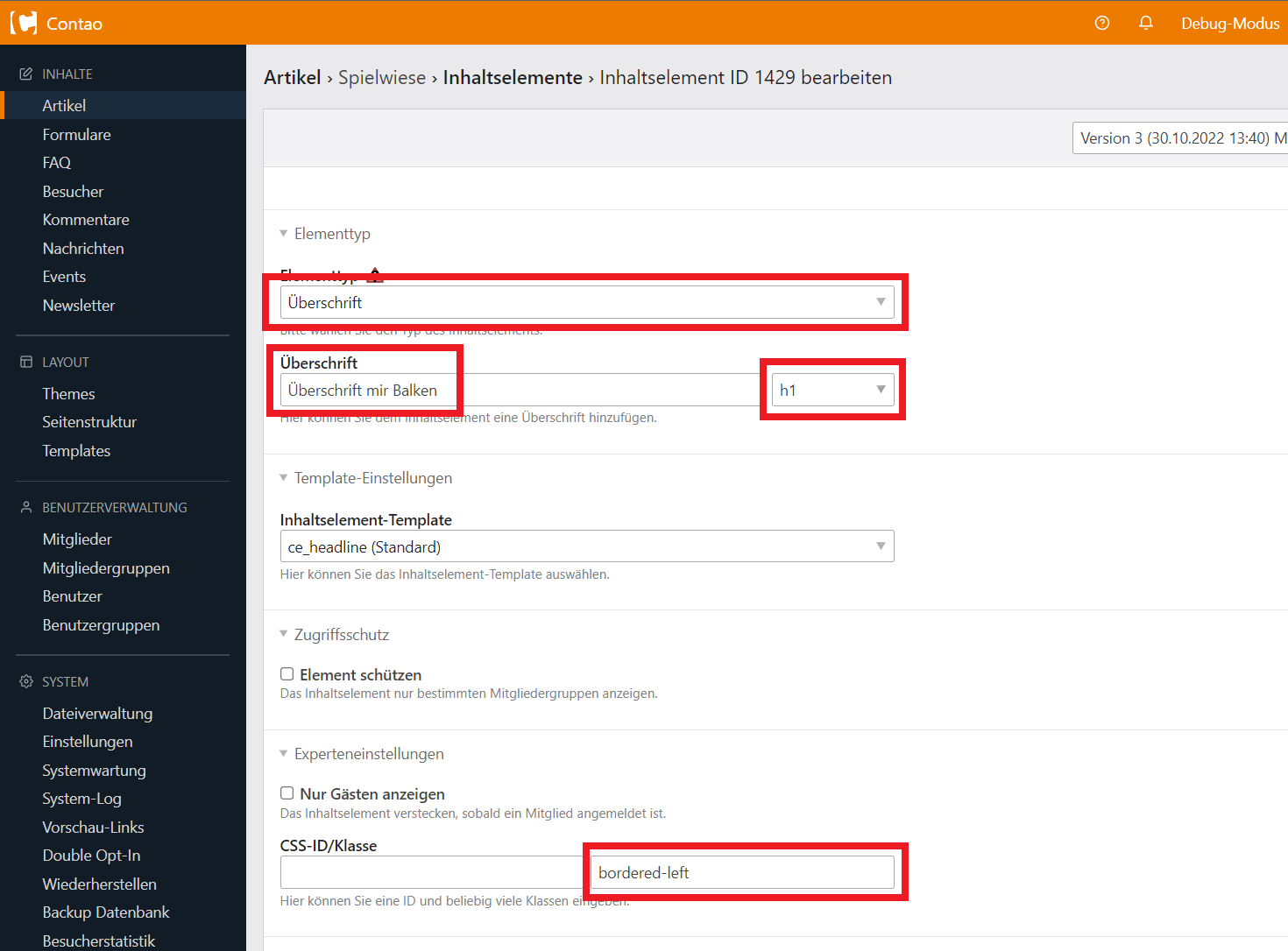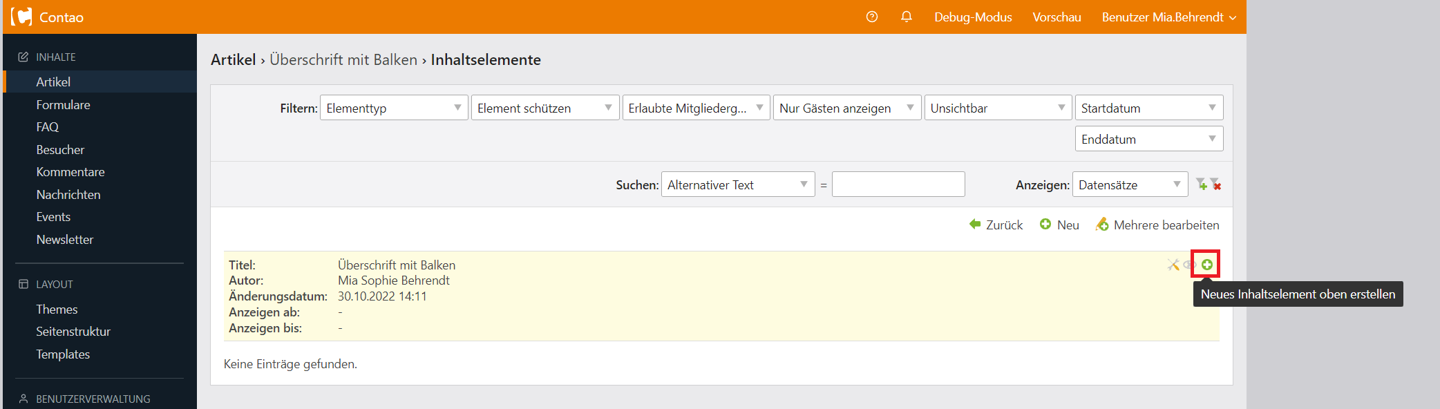 Sollte dies nicht der Fall sein, kann das Inhaltselement nachträglich verschoben werden.